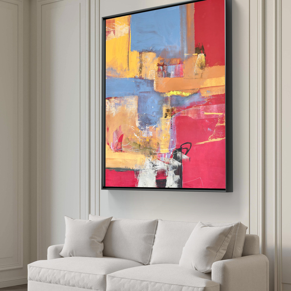 This artwork is a bold meditation on memory and resilience, rendered through vivid abstraction. Layers of red, ochre, and cobalt blue collide and coexist, echoing the architecture of inner landscapes - those fractured, rebuilt, and illuminated over time. The composition hums with energy, where rough geometry and raw textures speak of both structure and erosion. Fragments of warmth peek through veils of cooler tones, suggesting the persistence of light even in places worn by history.