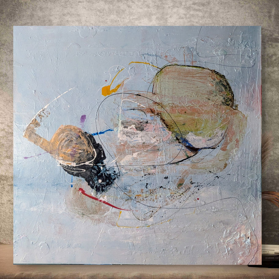 A layered abstract form gathers and folds into itself within a pale, atmospheric field. Gestural lines and fragments of color suggest movement held in suspension—an accumulation of weight, memory, and quiet tension.